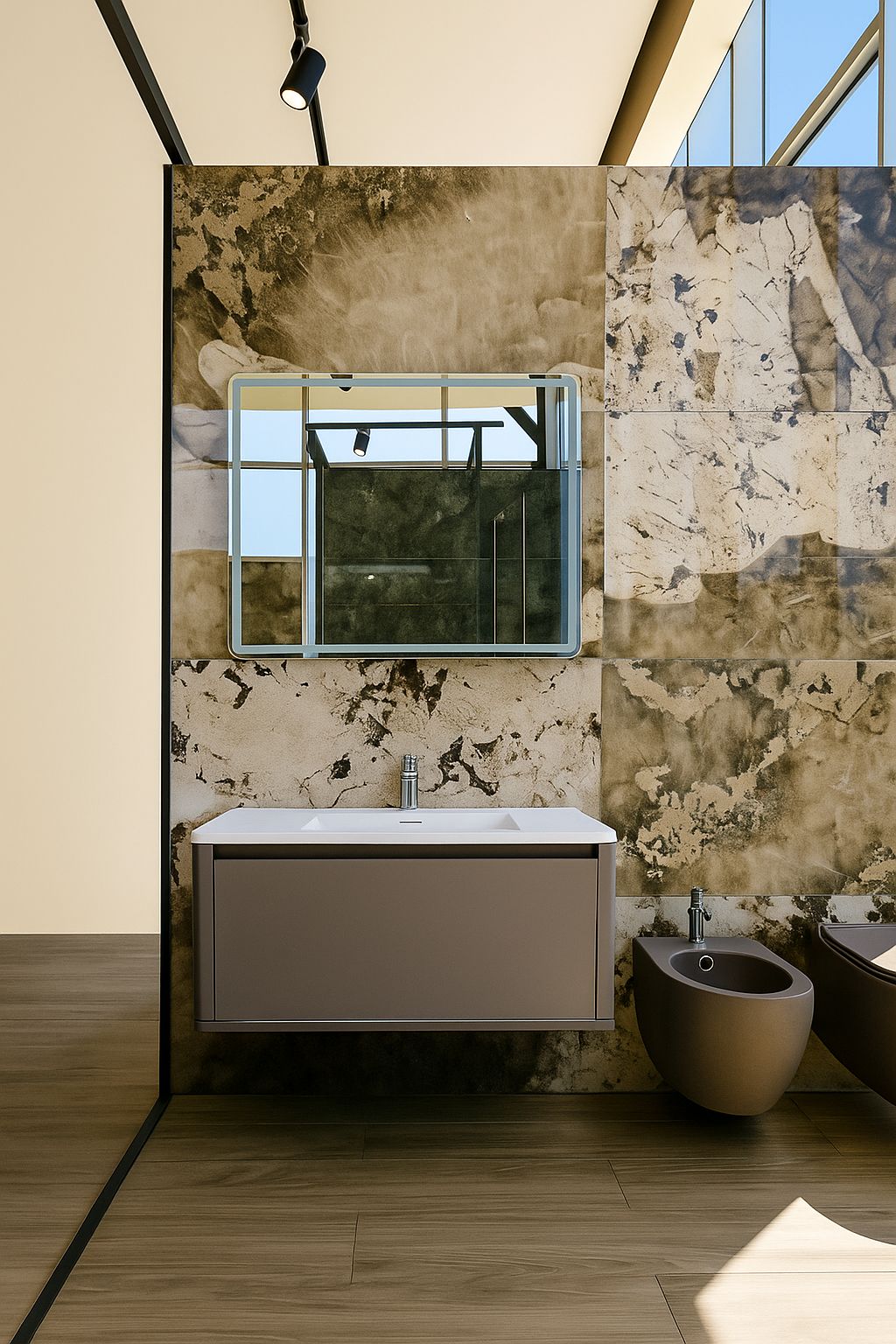 Mobilje lavamani dizajn bashkëkohor në ngjyrë krem-gri, rezistente ndaj ujit. Pasqyrë moderne që shton elegancë dhe ndriçim në çdo tualet.